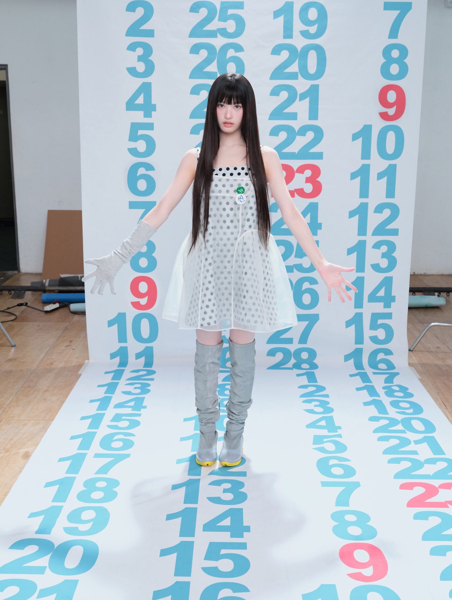 - YUJIN wore a gray dress covered in playful pin buttons and posed next to a costume rack labeled “BANG BANG”, closing out the photo series with her signature photogenic charm.